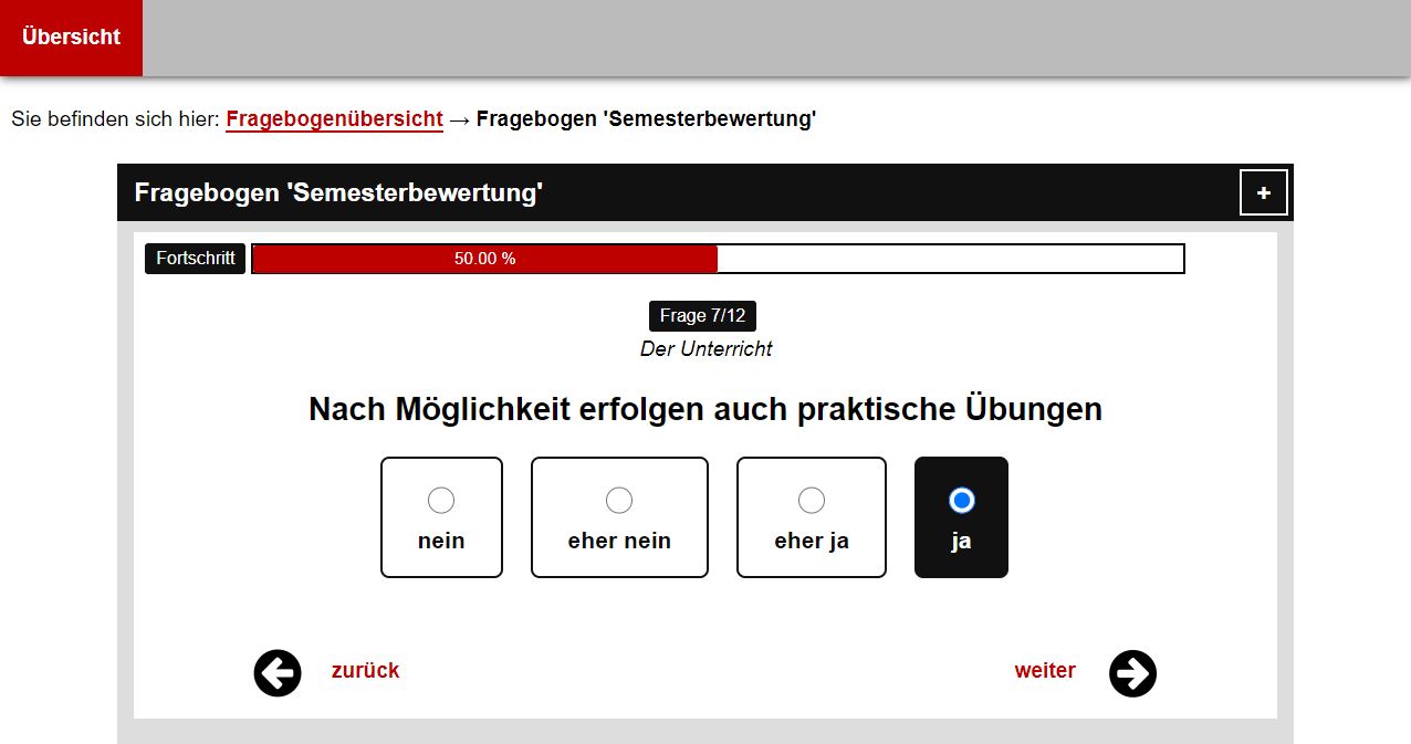 Haben Sie alle Fragen eines Fragebogens ausgefüllt, erscheint ein entsprechender Hinweistext, der Sie wieder zur Fragebogen-Übersicht leitet.