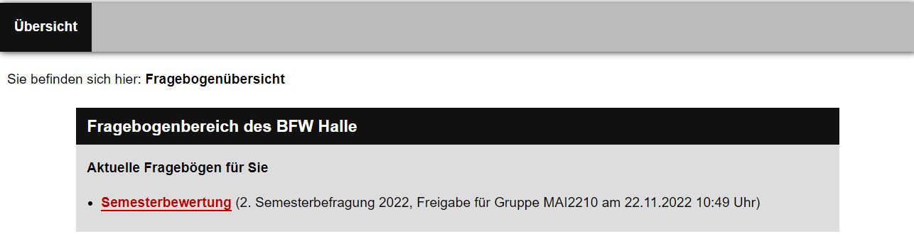 Als Befragungsteilnehmer sehen Sie nur einen Menüpunkt in der Navigationsleiste. Unter dem Menüpunkt „Übersicht“ werden alle für Sie freigegebenen Fragbögen aufgelistet. Diese sind sortiert nach dem Datum, wobei der älteste Fragebogen oben angezeigt wird.